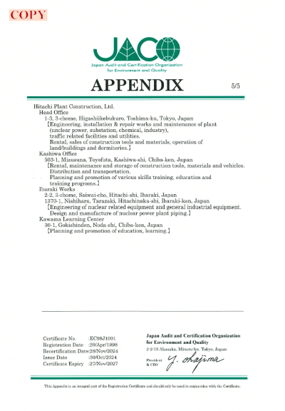 These initiatives will take into account the products and services provided by Hitachi Plant Construction as well as the processes and relationship with the environment. We will also work to continually improve our environmental management systems, observe all laws, regulations, and other requirements, and prevent pollution of the surrounding environment.